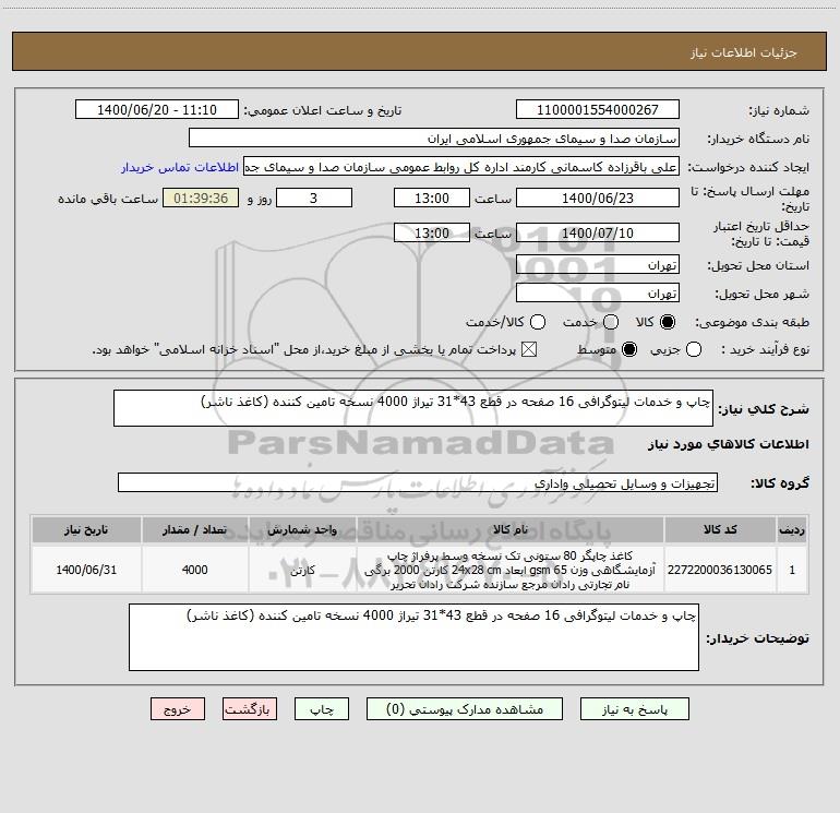شرح کلی نیاز: چاپ و خدمات لیتوگرافی 16 صفحه در قطع 43*31 تیراژ 4000 نسخه تامین کننده (کاغذ ناشر)