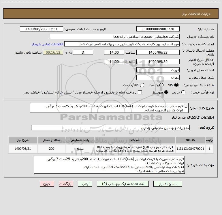 شرح کلی نیاز: فرم حکم ماموریت با فرمت ایران ایر (هما)فقط استان تهران به تعداد 200پدهر پد 25ست 7 برگی.