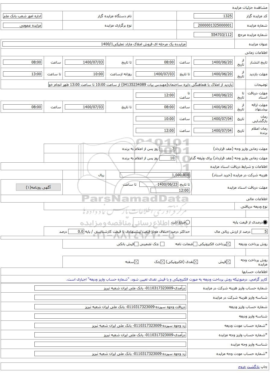 | شماره حساب واریز وجه مزایده | درآمدی-0110317323009- بانک ملی ایران شعبه تبریز |