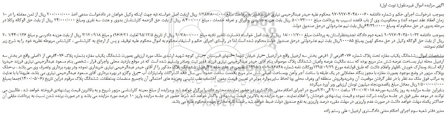 1- بموجب درخواست اجرای حکم و شماره دادنامه 9709970404800060 محکوم علیه حیدر عبدالرحیمی نیاری فرزند قدیر به پرداخت مبلغ 1/287/800/000 ریال ازبابت اصل خواسته (به جهت اینکه وکیل خواهان در دادخواست مدعی اخذ 200/000/000 ریال از ثمن معامله را در زمان انعقاد عقد نموده اند) و محکومیت وی از باب قاعده تسبیب به پرداخت مبلغ 50/073/000 ریال بابت هزینه دادرسی و اوراق و تعرفه خدمات ، مبلغ 8/400/000 ریال از بابت حق الزحمه کارشناسان بدوی و هئت سه نفری ومبلغ 24/000/000 ریال از بابت حق الوکاله وکلا در مرحله بدوی در حق محکوم له ومبلغ 64/390/000ریال بابت نیم عشردولتی درحق صندوق دولت