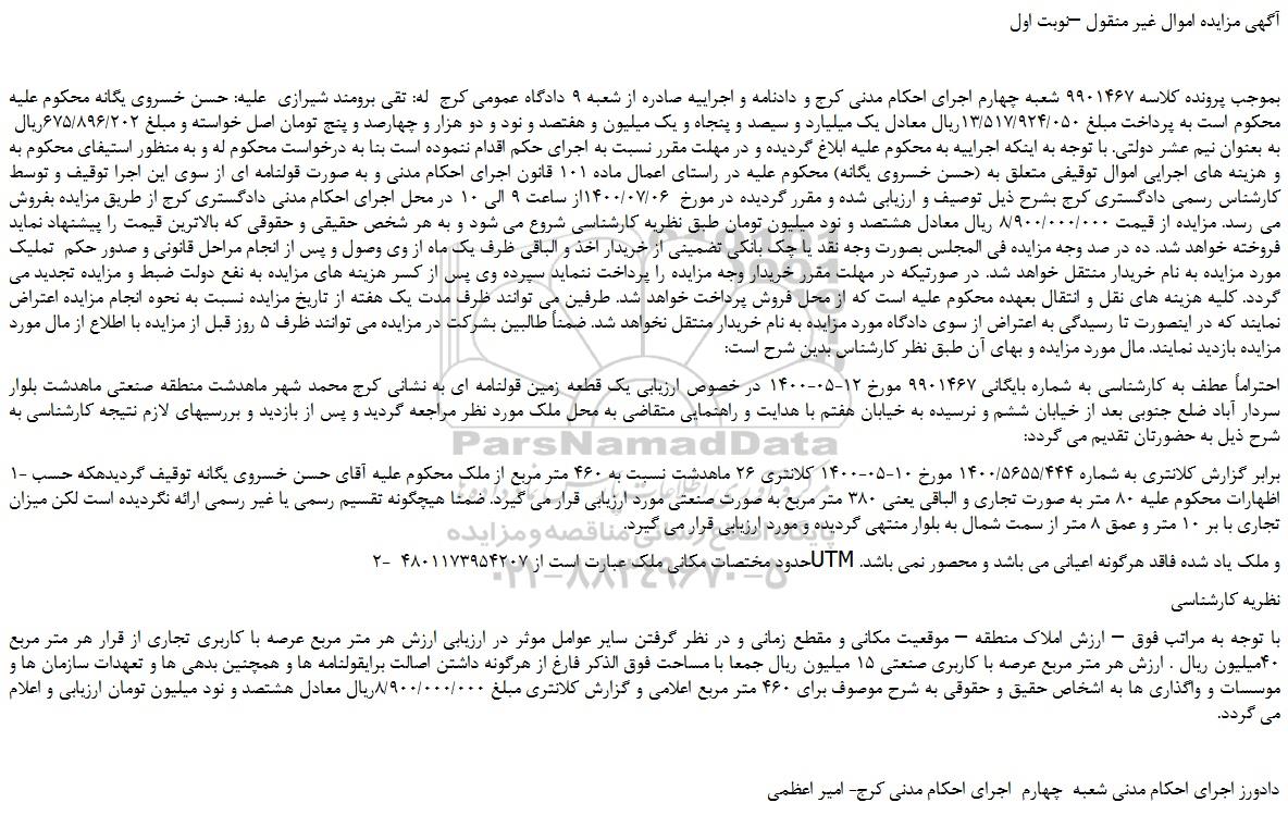 بموجب پرونده کلاسه 9901467 شعبه چهارم اجرای احکام مدنی کرج و دادنامه و اجراییه صادره از شعبه 9 دادگاه عمومی کرج  له: تقی برومند شیرازی  علیه: حسن خسروی یگانه محکوم علیه محکوم است به پرداخت مبلغ 13/517/924/050ریال معادل یک میلیارد و سیصد و پنجاه و یک میلیون و هفتصد و نود و دو هزار و چهارصد و پنج تومان اصل خواسته و مبلغ 675/896/202ریال  به بعنوان نیم عشر دولتی. با توجه به اینکه اجراییه به محکوم علیه ابلاغ گردیده و در مهلت مقرر نسبت به اجرای حکم اقدام ننموده است بنا به درخواست محکوم له و به منظور استیفای محکوم به و هزینه های اجرایی اموال توقیفی متعلق به (حسن خسروی یگانه) محکوم علیه در راستای اعمال ماده 101 قانون اجرای احکام مدنی و به صورت قولنامه ای از سوی این اجرا توقیف و توسط کارشناس رسمی دادگستری کرج بشرح ذیل توصیف و ارزیابی شده و مقرر گردیده در مورخ  1400/07/06از ساعت 9 الی 10 در محل اجرای احکام مدنی دادگستری کرج از طریق مزایده بفروش می رسد. مزایده از قیمت 8/900/000/000 ریال معادل هشتصد و نود میلیون تومان طبق نظریه کارشناسی شروع می شود و به هر شخص حقیقی و حقوقی که بالاترین قیمت را پیشنهاد نماید فروخته خواهد شد. ده در صد وجه مزایده فی المجلس بصورت وجه نقد یا چک بانکی تضمینی از خریدار اخذ و الباقی ظرف یک ماه از وی وصول و پس از انجام مراحل قانونی و صدور حکم  تملیک مورد مزایده به نام خریدار منتقل خواهد شد. در صورتیکه در مهلت مقرر خریدار وجه مزایده را پرداخت ننماید سپرده وی پس از کسر هزینه های مزایده به نفع دولت ضبط و مزایده تجدید می گردد. کلیه هزینه های نقل و انتقال بعهده محکوم علیه است که از محل فروش پرداخت خواهد شد. طرفین می توانند ظرف مدت یک هفته از تاریخ مزایده نسبت به نحوه انجام مزایده اعتراض نمایند که در اینصورت تا رسیدگی به اعتراض از سوی دادگاه مورد مزایده به نام خریدار منتقل نخواهد شد. ضمناً طالبین بشرکت در مزایده می توانند ظرف 5 روز قبل از مزایده با اطلاع از مال مورد مزایده بازدید نمایند. مال مورد مزایده و بهای آن طبق نظر کارشناس بدین شرح است: