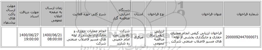 مناقصه، فراخوان ارزیابی کیفی انجام عملیات حفاری و جایگذاری بخشی از لوله های مسیر فاضلاب صنعتی شرکت, فراخوان ارزیابی کیفی انجام عملیات حفاری و جایگذاری بخشی از لوله های مسیر فاضلاب صنعتی شرکت