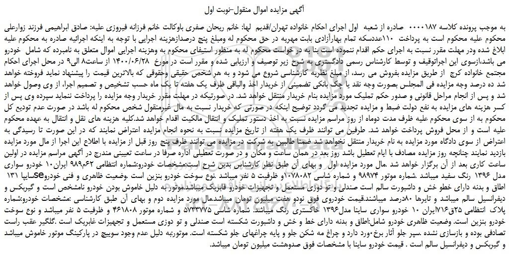 به موجب پرونده کلاسه 0000187 صادره از شعبه اول اجرای احکام خانواده تهران/قدیم لها: خانم ریحان صفری باوکالت خانم فرزانه فیروزی علیه: صادق ابراهیمی فرزند زوارعلی محکوم علیه محکوم است به پرداخت 110عددسکه تمام بهارآزادی بابت مهریه در حق محکوم له ومبلغ پنج درصدازهزینه اجرایی با توجه به اینکه اجرائیه صادره به محکوم علیه ابلاغ شده ودر مهلت مقرر نسبت به اجرای حکم اقدام ننموده است بنا به در خواست محکوم له به منظور استیفای محکوم به وهزینه اجرایی اموال متعلق به نامبرده که شامل خودرو می باشد،ازسوی این اجراتوقیف و توسط کارشناس رسمی دادگستری به شرح زیر توصیف و ارزیابی شده و مقرر است در مورخ 1400/06/28 از ساعت8 الی9 در محل اجرای احکام مجتمع خانواده کرج از طریق مزایده بفروش می رسد، از مبلغ نظریه کارشناسی شروع می شود و به هر شخص حقیقی وحقوقی که بالاترین قیمت را پیشنهاد نماید فروخته خواهد شد ده درصد وجه مزایده فی المجلس بصورت وجه نقد یا چک بانکی تضمینی از خریدار اخذ والباقی ظرف یک هفته تا یک ماه حسب تشخیص و تصمیم اجرا، از وی وصول خواهد شد و پس از انجام مراحل قانونی و صدور حکم تملیک مورد مزایده بنام خریدار منتقل خواهد شد. در صورتیکه در مهلت مقرر خریدار وجه مزایده را پرداخت ننماید سپرده وی پس از کسر هزینه های مزایده به نفع دولت ضبط و مزایده تجدید می گردد توضیح اینکه در صورتی که خریدار نسبت به مال غیرمنقول شخص محکوم له باشد در صورت عدم تودیع کل محکوم به از سوی محکوم علیه ظرف مدت دوماه از روز مراسم مزایده نسبت به اخذ دستور تملیک و انتقال مالکیت اقدام خواهد شد.کلیه هزینه های نقل و انتقال به عهده محکوم علیه است و از محل فروش پرداخت خواهد شد. طرفین می توانند ظرف یک هفته از تاریخ مزایده نسبت به نحوه انجام مزایده اعتراض نمایند که در این صورت تا رسیدگی به اعتراض از سوی دادگاه مورد مزایده به نام خریدار منتقل نخواهد شد ضمنا طالبین به شرکت در مزایده می توانند ظرف پنج روز قبل از مزایده با اطلاع این اجرا از مال مورد مزایده بازدید نمایند چنانچه روز مزایده مصادف با ایام تعطیل باشد روز بعد در همان ساعت و مکان و در صورت تعطیلی اداره صرفا در ساعت تعیینی مندرج در آگهی مراسم مزایده در اولین ساعت کاری بعد از آن برگزار خواهد شد .مال مورد مزایده اول و بهای آن طبق نظر کارشناس بدین شرح است:مشخصات خودرو:شماره انتظامی 62م989 ایران10 خودرو سواری سایپا 131 seمدل 1396 رنگ سفید میباشد .شماره موتور 98974 و شماره شاسی 1078082و ظرفیت 5 نفر میباشد .نوع سوخت خودرو بنزین است .وضعیت ظاهری و فنی خودرو اطاق و بدنه دارای خطو خش و داشبورت سالم است صندلی و تو دوزی مستعمل و تجهیزات خودرو فابریک میباشد.موتور به دلیل خاموش بودن خودرو نامشخص است و گیربکس و دیفرانسیل سالم میباشد و تایرها 80درصد میباشند.قیمت خودروی فوق نودو هفت میلیون تومان میباشد.مال مورد مزایده دوم و بهای آن طبق کارشناسی :مشخصات خودرو:شماره پلاک انتظامی 25ق716ایران 10 خودرو سواری ساینا مدل1396 خاکستری رنگ میباشد. شماره شاسی 5733775 و شماره موتور 461808 و ظرفیت 5 نفر میباشد و نوع سوخت خودرو بنزین است. وضعیت ظاهری خودرو شامل:اطاق و بدنه دارای خط و خش و داشبورت شکسته است صندلی و تو دوزی مستعمل و تجهیزات غابریک است .گلگیر عقب راست تصادفی بوده و بازسازی نشده .سپر جلو آثار برخ0ورد دارد و چراغ مه شکن جلو و پایه چراغهای جلو شکسته است. موتور:به دلیل عدم وجود سوییچ در پارکینگ موتور خاموش میباشد و گیربکس و دیفرانسیل سالم است . قیمت خودرو ساینا با مشخصات فوق صدوهشت میلیون تومان میباشد.
