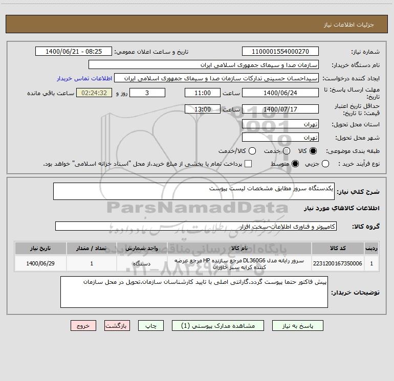 شرح کلی نیاز: یکدستگاه سرور مطابق مشخصات لیست پیوست