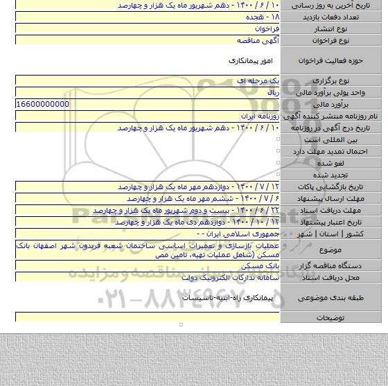 عملیات بازسازی و تعمیرات اساسی ساختمان شعبه فریدون شهر اصفهان بانک مسکن (شامل عملیات تهیه، تامین مص