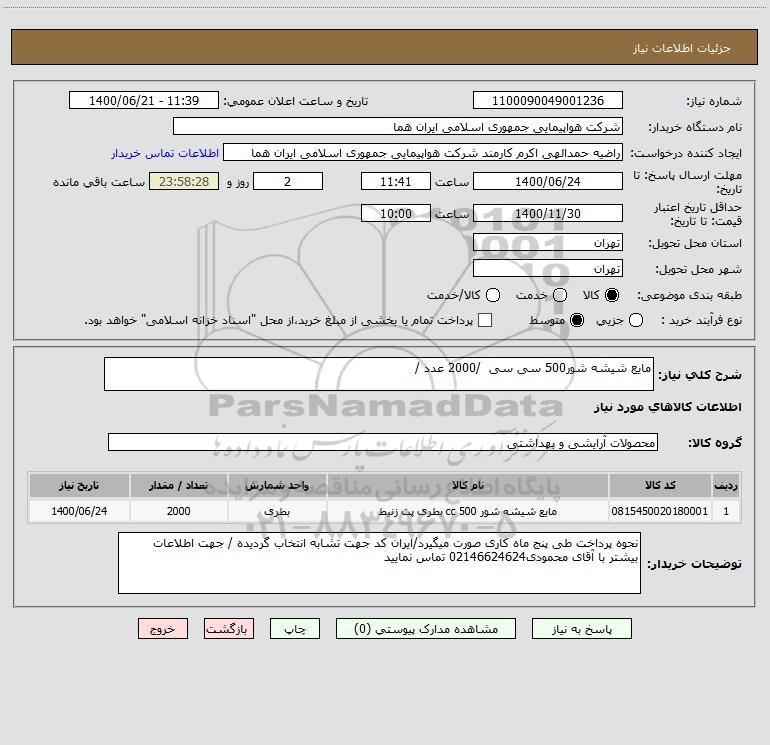 شرح کلی نیاز: مایع شیشه شور500 سی سی /2000 عدد /