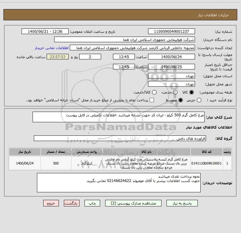 شرح کلی نیاز: مرغ کامل گرم 500 کیلو - ایران کد جهت تشابه میباشد -اطلاعات تکمیلی در فایل پیوست