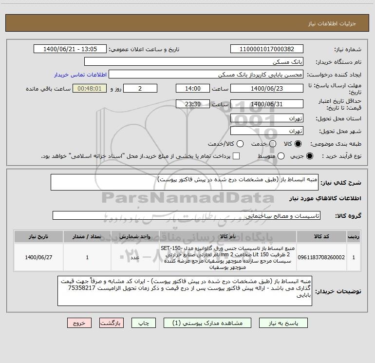 شرح کلی نیاز: منبه انبساط باز (طبق مشخصات درج شده در پیش فاکتور پیوست)