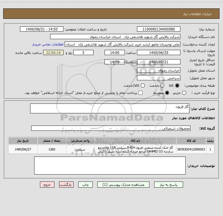 نام دستگاه خریدار:شرکت پالایش گاز شهید هاشمی نژاد استان خراسان رضوی