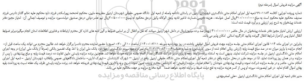 شماره پرونده اجرایی: کلاسه 9901184 شعبه اول اجرای احکام مدنی دادگستری شهرستان اردبیل در راستای دادنامه واصله از شعبه اول دادگاه عمومی حقوقی شهرستان اردبیل مطروحه مابین، محکوم له:محمد پوراسکندر فرزند داود محکوم علیه :خانم گلناز دادرس فرزند صدیف محکوم علیه محکوم است به مبلغ610/000/000ریال اصل خواسته ، هزینه دادرسی،خسارت تاخیر تادیه وحق الوکاله وکیل درحق محکوم له ومبلغ30/500/000ریال نیم عشر دولتی درحق صندوق دولت،مورد مزایده و توصیف اجمالی آن: امتیاز مجوز دفتر خدمات پیشخوان به شرح زیر ارزیابی و برآورد قیمت شده است؛