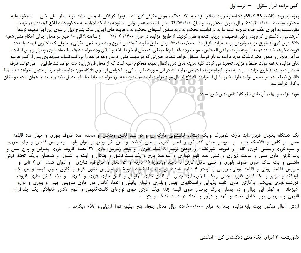 بموجب پرونده کلاسه 9902049و دادنامه واجراییه صادره از شعبه 13 دادگاه عمومی حقوقی کرج له زهرا کربلائی اسمعیل علیه نوید نظر علی خان محکوم علیه محکوم است به 691/400/000 ریال بعنوان محکوم به و مبلغ34/570/000 ریال بابت نیم عشر دولتی . با توجه به اینکه اجراییه به محکوم علیه ابلاغ گردیده و در مهلت مقررنسبت به اجرای حکم اقدام ننموده است بنا به درخواست محکوم له و به منظور استیفای محکوم به و هزینه های اجرایی ملک بشرح ذیل از سوی این اجرا توقیف توسط کارشناسی دادگستری کرج بشرح ذیل توصیف و ارزیابی شده و مقرر گردیده از طریق مزایده در مورخ 1400/ 6 /21 از ساعت 9 الی 10 صبح در محل اجرای احکام مدنی شعبه دادگستری کرج از طریق مزایده بفروش برسد. مزایده از قیمت 550/000/000 ریال طبق نظریه کارشناس شروع و به هر شخص حقیقی و حقوقی که بالاترین قیمت را بدهد فروخته خواهد شد. ده درصد از وجه مزایده را فی المجلس بصورت وجه نقد یا چک بانکی تضمینی از خریدار اخذ و الباقی وجه مزایده ظرف یک ماه از وی وصول و پس از انجام مراحل قانونی و صدور حکم تملیک مورد مزایده به نام خریدار منتقل خواهد شد. در صورتی که در مهلت مقرر خریدار وجه مزایده را پرداخت ننماید سپرده وی پس از کسر هزینه های مزایده به نفع دولت ضبط و مزایده تجدید می گردد. کلیه هزینه های نقل وانتقال بعهده محکوم علیه است که از محل فروش پرداخت خواهد شد طرفین می توانند ظرف مدت یک هفته از تاریخ مزایده نسبت به نحوه انجام مزایده اعتراض نمایند که در این صورت تا رسیدگی به اعتراض از سوی دادگاه مورد مزایده بنام خریدار منتقل نخواهد شد ضمنا طالبین شرکت در مزایده می توانند ظرف 5 روز قبل از مزایده بااطلاع از مال مورد مزایده بازدید نمایند.چنانجه روز مزایده مصادف با ایام تعطیل باشد روز بعددر همان ساعت و مکان برگزار خواهد شد