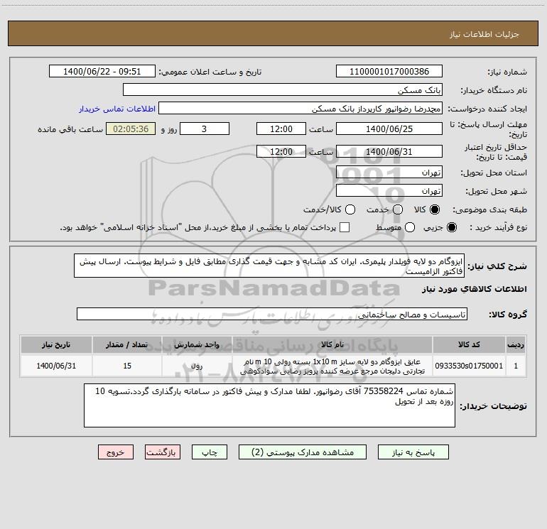 شرح کلی نیاز: ایزوگام دو لایه فویلدار پلیمری. ایران کد مشابه و جهت قیمت گذاری مطابق فایل و شرایط پیوست. ارسال پیش فاکتور الزامیست