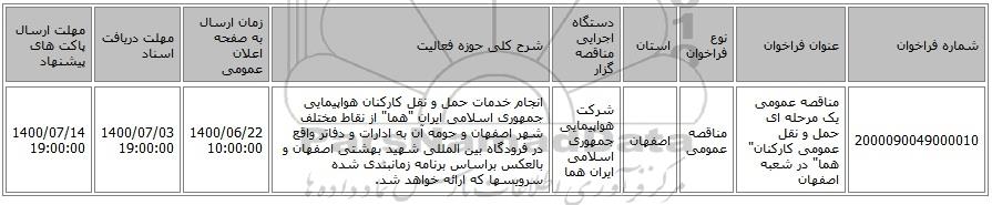 مناقصه، مناقصه عمومی یک مرحله ای حمل و نقل عمومی کارکنان" هما" در شعبه اصفهان , مناقصه عمومی یک مرحله ای حمل و نقل عمومی کارکنان" هما" در شعبه اصفهان