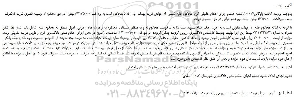 بموجب پرونده کلاسه بایگانی9900026شعبه هشتم اجرای احکام حقوقی کرج محکوم علیه شمس اله جوادی فرزند یوسف و... فعلا .محکوم است به پرداخت 27/175/000تومان در حق محکوم له تهمینه قصری فرزند غلامرضا و.... ، وپرداخت 1/350/000تومان بابت نیم عشر دولتی در حق صندوق دولت
