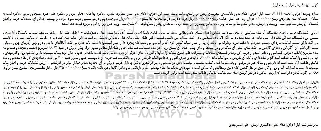 شماره پرونده اجرایی: کلاسه 960444 شعبه اول اجرای احکام مدنی دادگستری شهرستان اردبیل در راستای نیابت واصله شعبه اول اجرای احکام مدنی نمین مطروحه مابین، محکوم لها هانیه جلالی مرنی و محکوم علیه حمزه حسنخانی مرنی محکوم است به تعداد114عددسکه تمام بهارآزادی ومبلغ500/000/000ریال وجه نقد  اصل خواسته ومبلغ98/100/000ریال هزینه دادرسی درحق محکوم لها ومبلغ82/000/000ریال نیم عشر دولتی درحق صندوق دولت ،مورد مزایده و توصیف اجمالی آن: ششدانگ عرصه و اعیان یکدستگاه آپارتمان مسکونی طبقه اول،بنشانی اردبیل، میدان حکیم نظامی ،محله پیر مادر، خیابان پاسداران، بن بست آزاده ، ساختمان چهار واحده(پیلوت + 4 طبقه)،طبقه اول،به شرح زیر ارزیابی و برآورد قیمت شده است؛