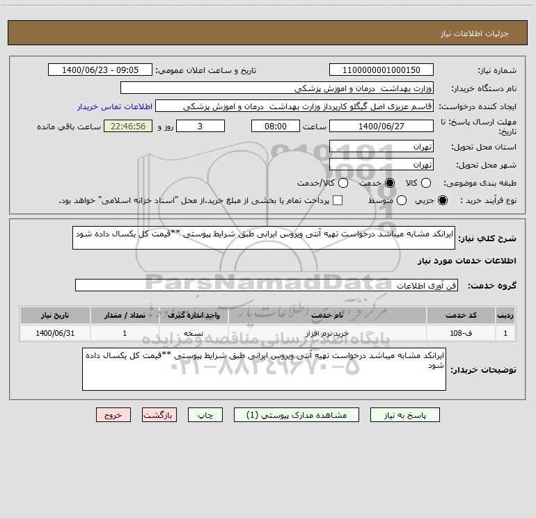 شرح کلی نیاز: ایرانکد مشابه میباشد درخواست تهیه آنتی ویروس ایرانی طبق شرایط پیوستی **قیمت کل یکسال داده شود