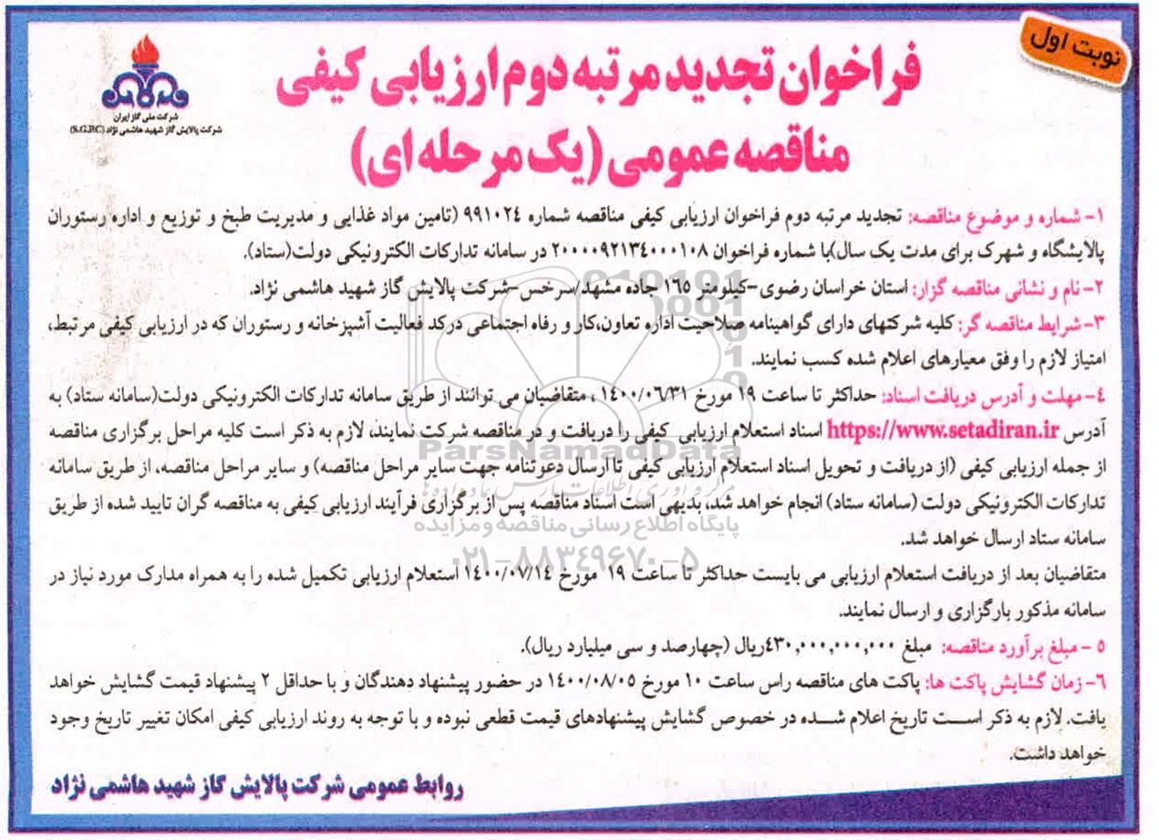 1- شماره و موضوع مناقصه: تجدید مرتبه دوم فراخوان ارزیابی کیفی مناقصه شماره 991024 و تامین مواد غذایی و مدیریت طبخ و توزیع و اداره رستوران پالایشگاه و شهرک برای مدت یکسال با شماره فراخوان 2000092134000108 در سامانه تدارکات الکترونیکی دولت ستاد