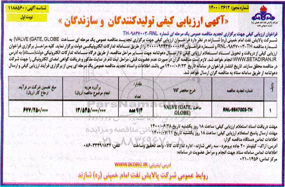 شرکت پالایش نفت امام خمینی (ره) شازند در نظر دارد فراخوان ارزیابی کیفی جهت برگزاری تجدید مناقصه عمومی دو مرحله ای ساخت (VALVE (GAGE, GLOBE به شماره RNL- 9847003-TH و شماره فراخوان 20000924470000066 را از طریق سامانه تدارکات الکترونیکی دولت برگزار نماید کلیه مراحل برگزاری فراخوان ارزیابی کیفی از دریافت و تحویل اسناد استعلام ارزیابی کیفی تا ارسال دعوت نامه جهت سایر مراحل مناقصه از طریق درگاه سامانه تدارکات الکترونیکی دولت ستاد به آدرس ستاد ایران انجام خواهد شد لازم است مناقصه گران در صورت عدم عضویت قبلی مراحل ثبت نام در سایت مذکور و دریافت گواهی امضای الکترونیکی ار جهت شرکت در مناقصه محقق سازند تاریخ انتشار فراخوان در سامانه تاریخ 1400.6.23 می باشد اطلاعات و اسناد تجدید مناقصه عمومی پس از برگزاری فرایند ارزیابی کیفی و ارسال دعوتنامه از طریق سامانه ستاد به مناقصه گران ارسال خواهد شد