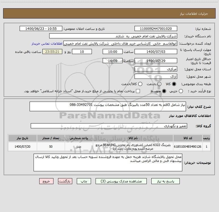 شرح کلی نیاز: نیاز شامل 3قلم به تعداد 50عدد بالبیرنگ طبق مشخصات پیوست 33492701-086