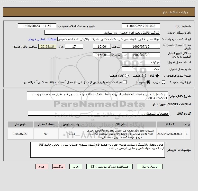 شرح کلی نیاز: نیاز شامل 3 قلم بع تعداد 90 قوطی اسپری مایعات نافذ دمابالا جهت بازرسی فنی طبق مشخصات پیوست 33492701-086