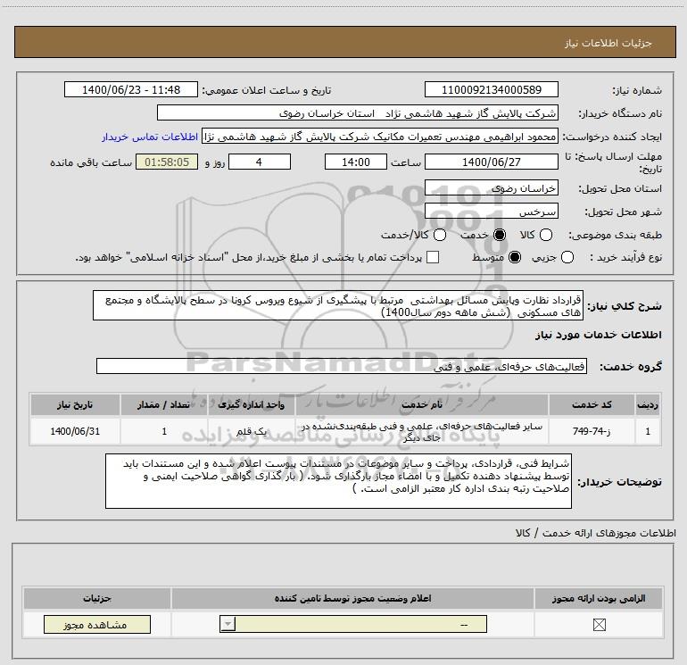 شرح کلی نیاز: قرارداد نظارت وپایش مسائل بهداشتی مرتبط با پیشگیری از شیوع ویروس کرونا در سطح پالایشگاه و مجتمع های مسکونی (شش ماهه دوم سال1400)