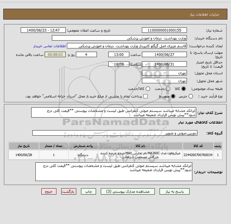 شرح کلی نیاز: ایرانکد مشابه میباشد سیستم صوتی کنفرانس طبق لیست و مشخصات پیوستی **قیمت کلی درج شود**پیش نویس قرارداد ضمیمه میباشد