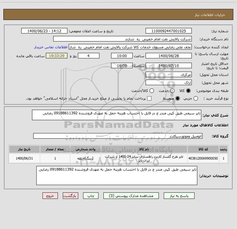 شرح کلی نیاز: تایر سیمی طبق کپی مندر ج در فایل با احتساب هزینه حمل به عهدی فروشنده 09188611392 رضایی