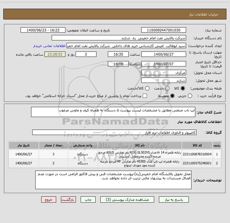 شرح کلی نیاز: لپ تاب صنعتی مطابق با مشخصات لیست پیوست ۵ دستگاه به همراه کیف و ماوس مرغوب
