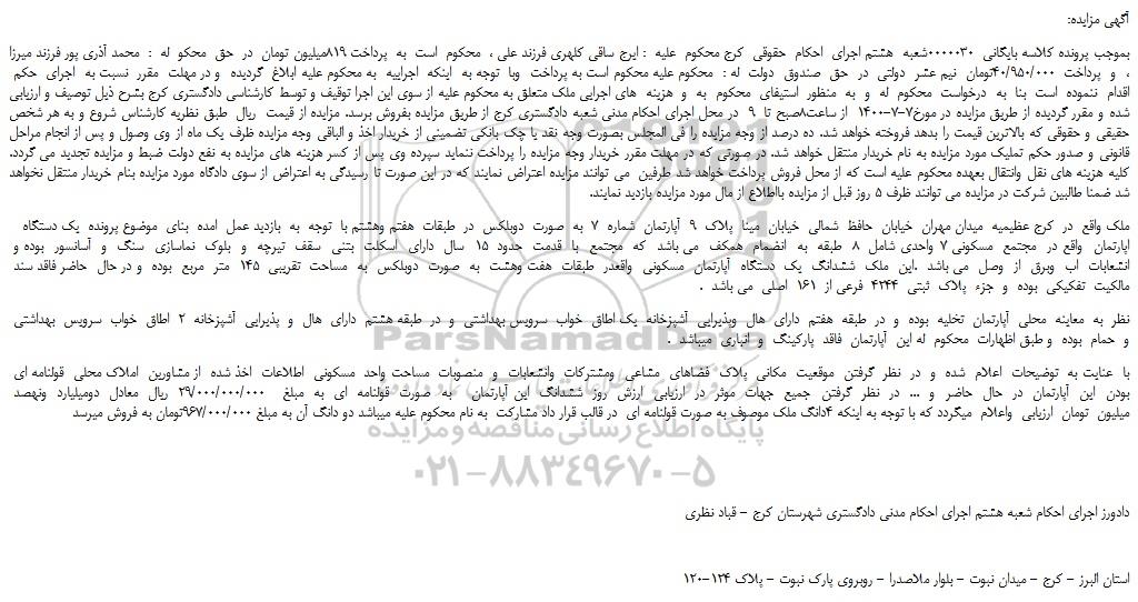 بموجب پرونده کلاسه بایگانی 0000030شعبه هشتم اجرای احکام حقوقی کرج محکوم علیه : ایرج ساقی کلهری فرزند علی ، محکوم است به پرداخت 819میلیون تومان در حق محکو له : محمد آذری پور فرزند میرزا ، و پرداخت 40/950/000تومان نیم عشر دولتی در حق صندوق دولت له : محکوم علیه محکوم است به پرداخت وبا توجه به اینکه اجراییه به محکوم علیه ابلاغ گردیده و در مهلت مقرر نسبت به اجرای حکم اقدام ننموده است بنا به درخواست محکوم له و به منظور استیفای محکوم به و هزینه های اجرایی ملک متعلق به محکوم علیه از سوی این اجرا توقیف و توسط کارشناسی دادگستری کرج بشرح ذیل توصیف و ارزیابی شده و مقرر گردیده از طریق مزایده در مورخ7-7-1400 از ساعت8صبح تا 9 در محل اجرای احکام مدنی شعبه دادگستری کرج از طریق مزایده بفروش برسد. مزایده از قیمت ریال طبق نظریه کارشناس شروع و به هر شخص حقیقی و حقوقی که بالاترین قیمت را بدهد فروخته خواهد شد. ده درصد از وجه مزایده را فی المجلس بصورت وجه نقد یا چک بانکی تضمینی از خریدار اخذ و الباقی وجه مزایده ظرف یک ماه از وی وصول و پس از انجام مراحل قانونی و صدور حکم تملیک مورد مزایده به نام خریدار منتقل خواهد شد. در صورتی که در مهلت مقرر خریدار وجه مزایده را پرداخت ننماید سپرده وی پس از کسر هزینه های مزایده به نفع دولت ضبط و مزایده تجدید می گردد. کلیه هزینه های نقل وانتقال بعهده محکوم علیه است که از محل فروش پرداخت خواهد شد طرفین می توانند مزایده اعتراض نمایند که در این صورت تا رسیدگی به اعتراض از سوی دادگاه مورد مزایده بنام خریدار منتقل نخواهد شد ضمنا طالبین شرکت در مزایده می توانند ظرف 5 روز قبل از مزایده بااطلاع از مال مورد مزایده بازدید نمایند.