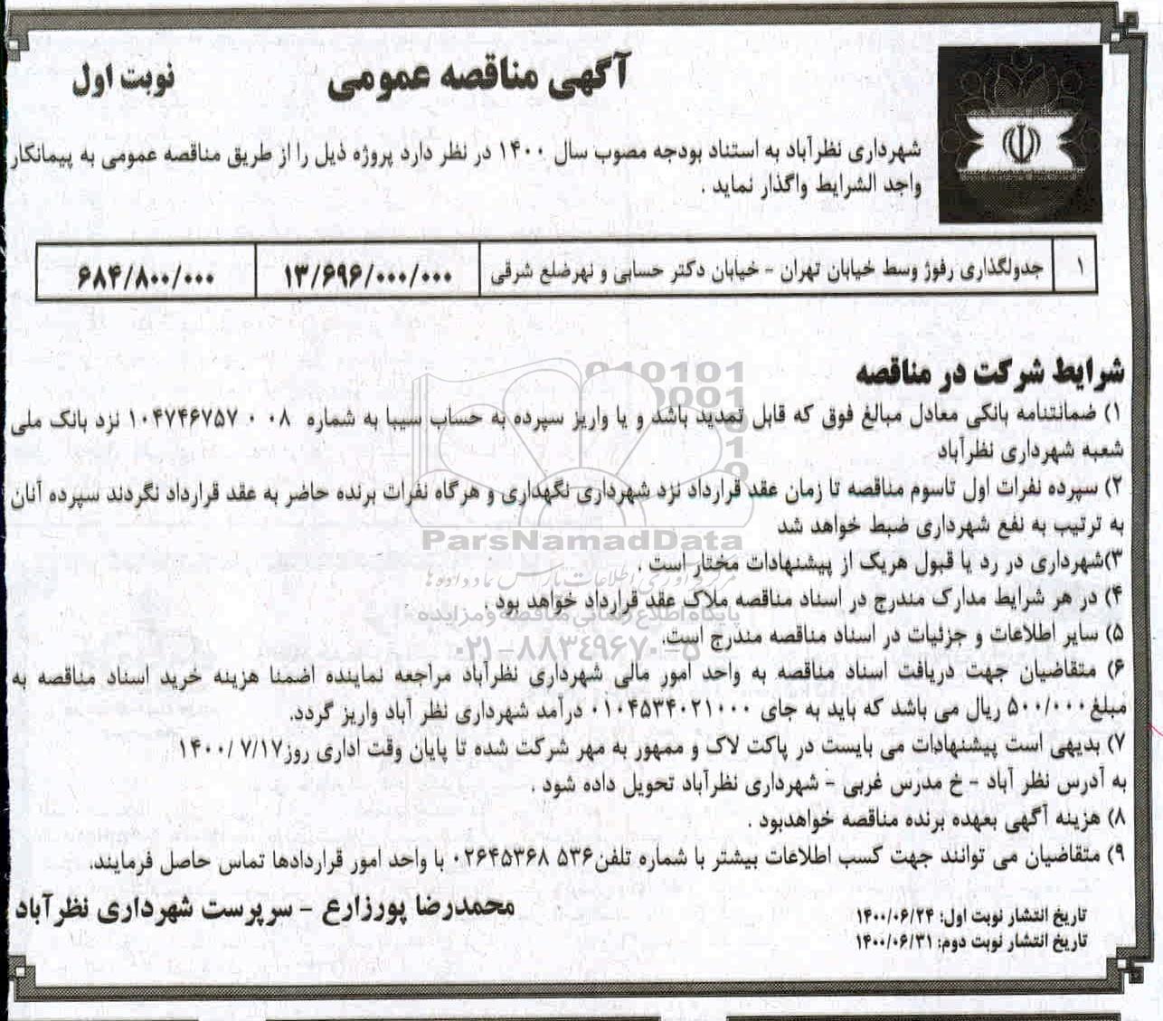 شهرداری نظرآباد به استناد بودجه مصوب سال 1400 در نظر دارد پروژه های ذیل را از طریق مناقصه عمومی به پیمانکاران واجدالشرایط واگذار نماید.