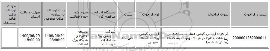 | 2000001262000011 | فراخوان ارزیابی کیفی عملیات ساختمانی برج های خطوط در مبادی ورودی پست ها (بخش ششم) | ارزیابی کیفی برای مناقصه عمومی | خوزستان | شرکت سهامی برق منطقه ای خوزستان | توسعه خطوط و شبکه برق استان | 1400/06/24 08:00:00 | 1400/06/29 18:00:00 |