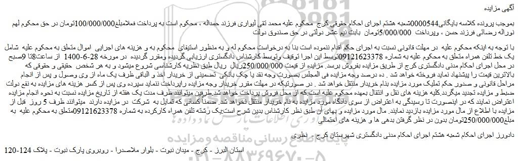 با توجه به اینکه محکوم علیه  در مهلت قانونی نسبت به اجرای حکم اقدام ننموده است بنا به درخواست محکوم له و به منظور استیفای  محکوم به و هزینه های اجرایی  اموال متعلق به محکوم علیه  شامل یک خط تلفن همراه متعلق به محکوم علیه به شماره 09121623378توسط این اجرا توقیف وتوسط کارشناس دادگستری ارزیابی گردیده ومقرر گردیده  در مورخه 28-6-1400  از ساعت8تا 9صبح در محل اجرای احکام مدنی دادگستری کرج از طریق مزایده بفروش برسد. مزایده از قیمت 250/000/000ریال  ریال طبق نظریه کارشناسی شروع میشود و به هر شخص  حقیقی و حقوقی که بالاترین قیمت را پیشنهاد نماید فروخته خواهد شد . ده درصد وجه مزایده فی المجلس بصورت وجه نقد یا چک بانکی  تضمینی از خریدار اخذ و الباقی ظرف یک ماه از وی وصول و پس از انجام مراحل قانونی و صدور حکم تملیک مورد مزایده بنام خریدار منتقل خواهد شد . در صورتیکه در مهلت مقرر خریدار وجه مزایده راپرداخت ننماید سپرده وی پس از کسر هزینه های مزایده به نفع دولت ضبط و مزایده تجدید میگردد.کلیه هزینه های نقل و انتقال بعهده محکوم علیه است.که از محل فروش پرداخت خواهد شد.طرفین میتوانند ظرف مدت یک هفته از تاریخ مزایده نسبت به نحوه انجام مزایده اعتراض نمایند که در اینصورت تا رسیدگی به اعتراض از سوی دادگاه مورد مزایده به نام خریدار منتقل نخواهد شد. ضمناً کسانی که تمایل به  شرکت  در مزایده دارند  میتوانند ظرف 5 روز  قبل از مزایده با اطلاع از مال مورد مزایده بازدید نمایند. مال مورد مزایده و بهای آن طبق نظر کارشناس بدین شرح است:یک رشته تلفن همراه کارکرده به شماره 09121623378متعلق به محکوم علیه  به مبلغ250/000/000تومان بدون در نظر گرفتن بدهی ها و هزینه های احتمالی