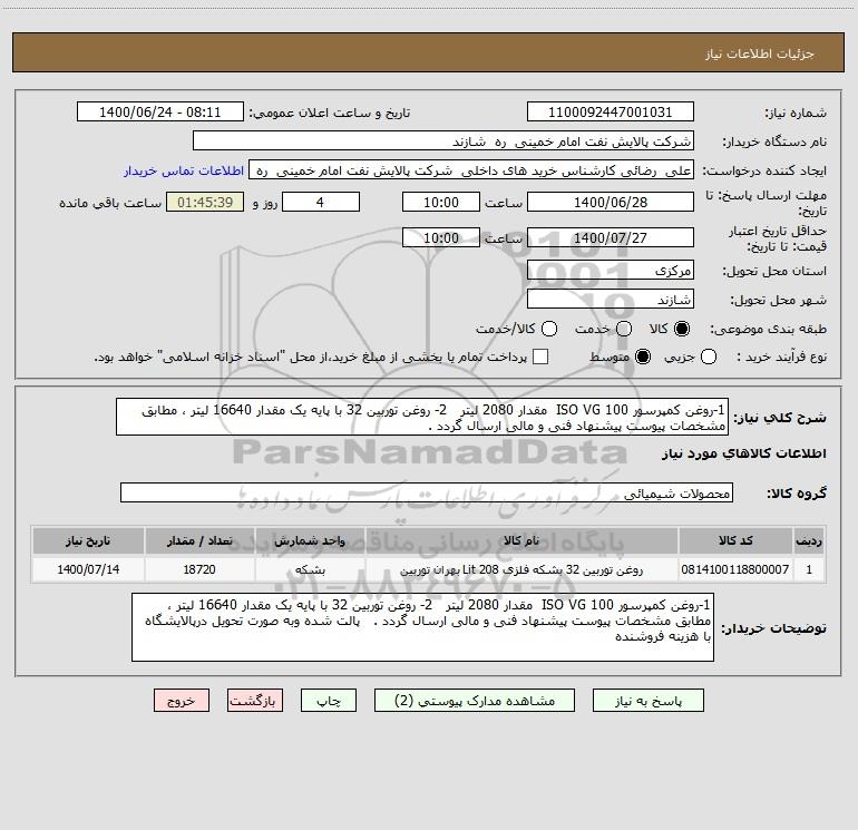 شرح کلی نیاز: 1-روغن کمپرسور ISO VG 100 مقدار 2080 لیتر 2- روغن توربین 32 با پایه یک مقدار 16640 لیتر ، مطابق مشخصات پیوست پیشنهاد فنی و مالی ارسال گردد .