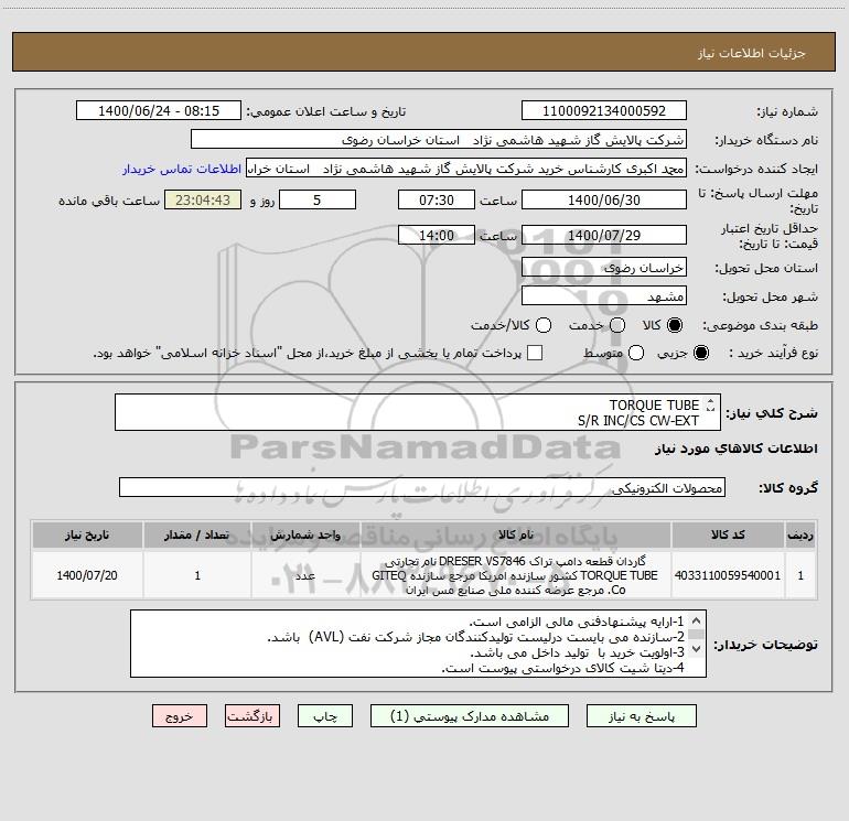 شرح کلی نیاز: TORQUE TUBE