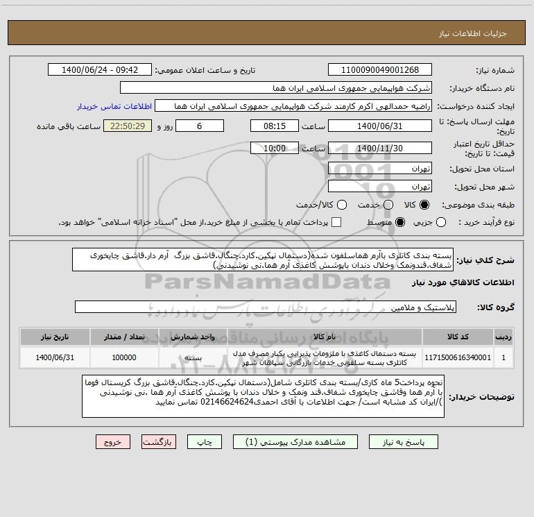 شرح کلی نیاز: بسته بندی کاتلری باآرم هماسلفون شده(دستمال نپکین.کارد.چنگال.قاشق بزرگ آرم دار.قاشق چایخوری شفاف.قندونمک وخلال دندان باپوشش کاغذی آرم هما.نی نوشیدنی)