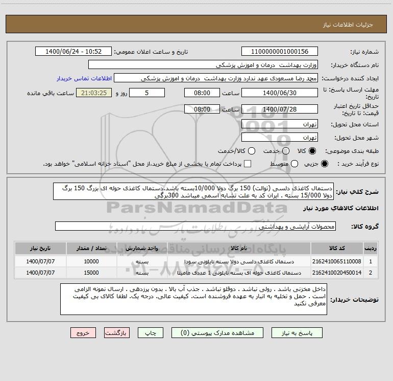 شرح کلی نیاز: دستمال کاغذی دلسی (توالت) 150 برگ دولا 10/000بسته باشد.دستمال کاغذی حوله ای بزرگ 150 برگ دولا 15/000 بسته . ایران کد به علت تشابه اسمی میباشد 300برگی