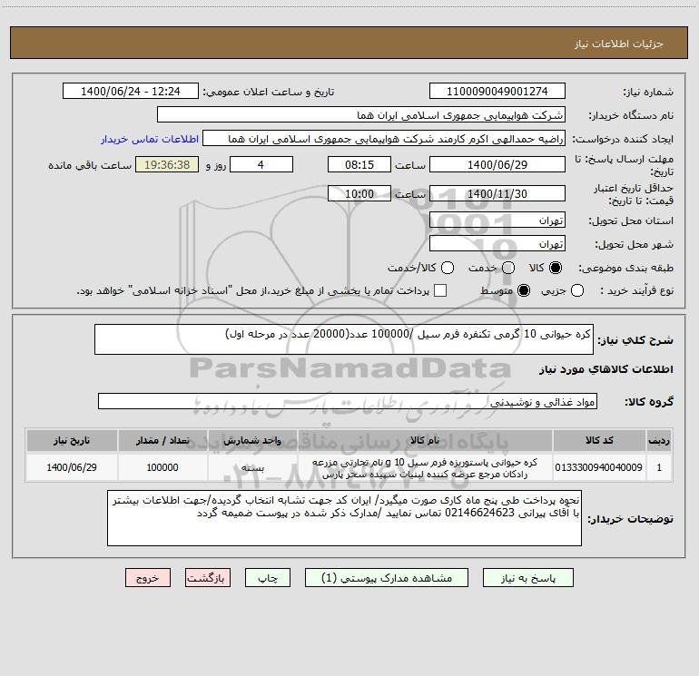 شرح کلی نیاز: کره حیوانی 10 گرمی تکنفره فرم سیل /100000 عدد(20000 عدد در مرحله اول)