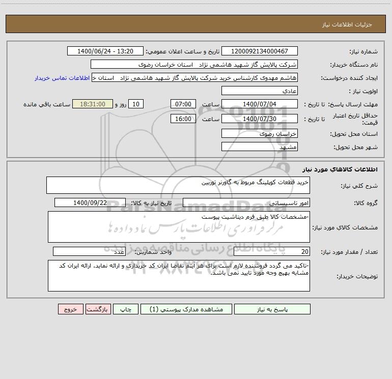 نام دستگاه خریدار:شرکت پالایش گاز شهید هاشمی نژاد استان خراسان رضوی