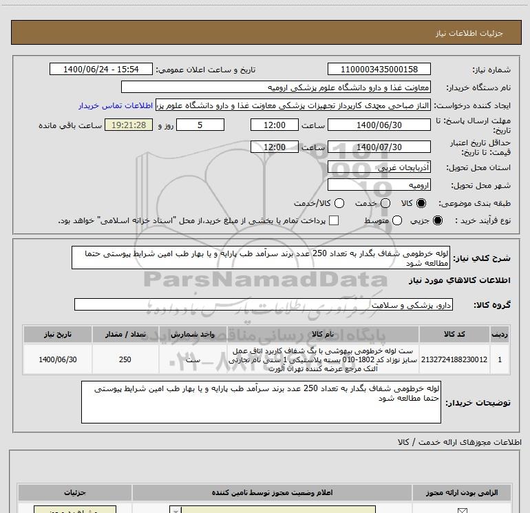 شرح کلی نیاز: لوله خرطومی شفاف بگدار به تعداد 250 عدد برند سرآمد طب پارایه و یا بهار طب امین شرایط پیوستی حتما مطالعه شود