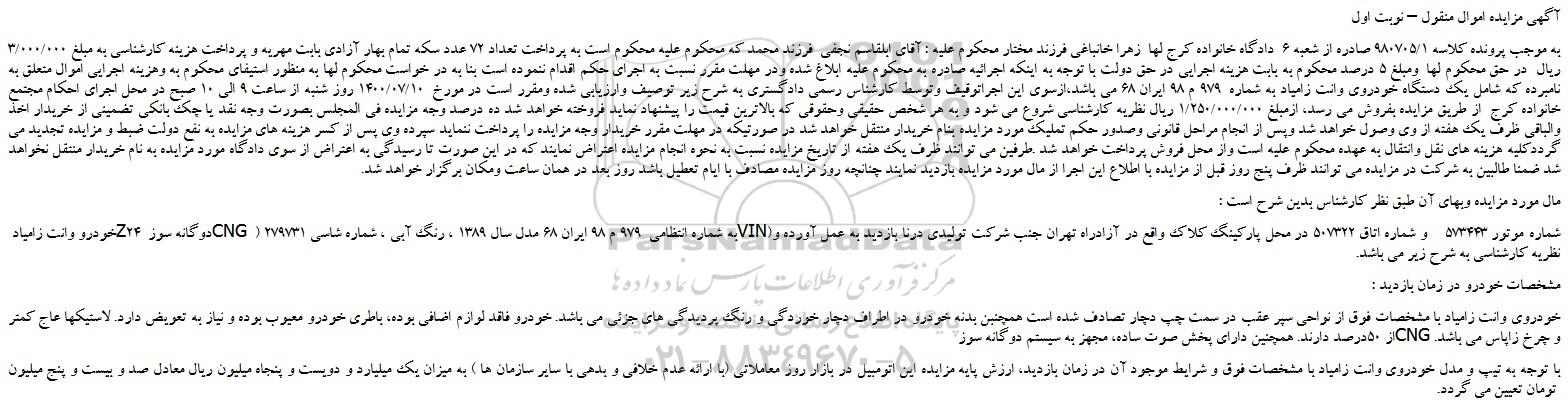 به موجب پرونده کلاسه 980705/1 صادره از شعبه 6 دادگاه خانواده کرج لها زهرا خانباغی فرزند مختار محکوم علیه : آقای ابلقاسم نجفی فرزند محمد که محکوم علیه محکوم است به پرداخت تعداد 72 عدد سکه تمام بهار آزادی بابت مهریه و پرداخت هزینه کارشناسی به مبلغ 3/000/000 ریال در حق محکوم لها ومبلغ 5 درصد محکوم به بابت هزینه اجرایی در حق دولت با توجه به اینکه اجرائیه صادره به محکوم علیه ابلاغ شده ودر مهلت مقرر نسبت به اجرای حکم اقدام ننموده است بنا به در خواست محکوم لها به منظور استیفای محکوم به وهزینه اجرایی اموال متعلق به نامبرده که شامل یک دستگاه خودروی وانت زامیاد به شماره 979 م 98 ایران 68 می باشد،ازسوی این اجراتوقیف وتوسط کارشناس رسمی دادگستری به شرح زیر توصیف وارزیابی شده ومقرر است در مورخ 1400/07/10 روز شنبه از ساعت 9 الی 10 صبح در محل اجرای احکام مجتمع خانواده کرج از طریق مزایده بفروش می رسد، ازمبلغ 1/250/000/000 ریال نظریه کارشناسی شروع می شود و به هر شخص حقیقی وحقوقی که بالاترین قیمت را پیشنهاد نماید فروخته خواهد شد ده درصد وجه مزایده فی المجلس بصورت وجه نقد یا چک بانکی تضمینی از خریدار اخذ والباقی ظرف یک هفته از وی وصول خواهد شد وپس از انجام مراحل قانونی وصدور حکم تملیک مورد مزایده بنام خریدار منتقل خواهد شد در صورتیکه در مهلت مقرر خریدار وجه مزایده را پرداخت ننماید سپرده وی پس از کسر هزینه های مزایده به نفع دولت ضبط و مزایده تجدید می گرددکلیه هزینه های نقل وانتقال به عهده محکوم علیه است واز محل فروش پرداخت خواهد شد .طرفین می توانند ظرف یک هفته از تاریخ مزایده نسبت به نحوه انجام مزایده اعتراض نمایند که در این صورت تا رسیدگی به اعتراض از سوی دادگاه مورد مزایده به نام خریدار منتقل نخواهد شد ضمنا طالبین به شرکت در مزایده می توانند ظرف پنج روز قبل از مزایده با اطلاع این اجرا از مال مورد مزایده بازدید نمایند چنانچه روز مزایده مصادف با ایام تعطیل باشد روز بعد در همان ساعت ومکان برگزار خواهد شد.