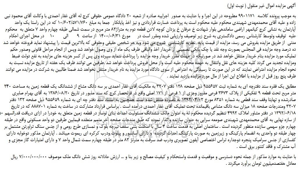 به موجب پرونده کلاسه 9901171 مطروحه در این اجرا و با عنایت به صدور اجراییه صادره از شعبه 20 دادگاه عمومی حقوقی کرج له آقای غفار احمدی با وکالت آقای محمود نبی زاده و علیه آقای محمدمهدی شهبندی محکوم علیه محکوم است به پرداخت خسارت قراردادی و نیز اخذ پایانکار جمعا به مبلغ 10/602/571/760 که در این راستا یک واحد آپارتمان به نشانی کرج کیانمهر اراضی ساماندهی بلوار شهادت خ عرفان خ یزدان کوچه لادن قطعه دوم به متراژ82 متر مربع در سمت شمالی طبقه چهارم واحد 7 متعلق به محکوم علیه توقیف وتوسط کارشناس رسمی دادگستری به شرح زیر توصیف وارزیابی شده ومقرر است در مورخ 1400/06/31 از ساعت 9 الی 10 در محل اجرای احکام مدنی از طریق مزایده بفروش می رسد، مزایده از قیمت پایه نظریه کارشناسی شروع می شود وبه هر شخص حقیقی وحقوقی که بالاترین قیمت را پیشنهاد نماید فروخته خواهد شد ده درصد وجه مزایده فی المجلس بصورت وجه نقد یا چک بانکی تضمینی از خریدار اخذ والباقی ظرف یک ماه از وی وصول خواهد شد وپس از انجام مراحل قانونی وصدور حکم تملیک مورد مزایده بنام خریدار منتقل خواهد شد در صورتیکه در مهلت مقرر خریدار وجه مزایده را پرداخت ننماید سپرده وی پس از کسر هزینه های مزایده به نفع دولت ضبط ومزایده تجدید می گردد کلیه هزینه های نقل وانتقال به عهده محکوم علیه است واز محل فروش پرداخت خواهد شد .طرفین می توانند ظرف یک هفته از تاریخ مزایده نسبت به نحوه انجام مزایده اعتراض نمایند که در این صورت تا رسیدگی به اعتراض از سوی دادگاه مورد مزایده به نام خریدار منتقل نخواهد شد ضمنا طالبین به شرکت در مزایده می توانند ظرف پنج روز قبل از مزایده با اطلاع این اجرا از مال مورد مزایده بازدید نمایند .