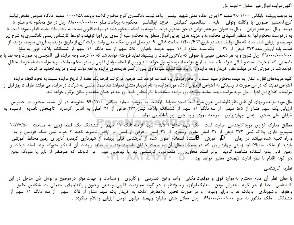 به موجب پرونده  بایگانی  9901100 شعبه 3 اجرای احکام مدنی شهید  بهشتی  واحد نیابت دادگستری کرج موضوع کلاسه پرونده 0000658  شعبه  دادگاه عمومی حقوقی نیابت کرج له:سمیرا  صبوری  با  وکالت  وثوقی    علیه  :  عبدالحمید  کمپانیان    فرزند  ابوالقاسم    محکوم به پرداخت مبلغ 88/000/000/000  ریال در حق محکوم له و مبلغ  5 درصد  ریال  نیم عشر دولتی    ریال به عنوان نیم عشر دولتی در حق صندوق دولت. با توجه به اینکه محکوم علیه در مهلت قانونی نسبت به انجام مفاد نیابت اقدام ننموده است بنا به درخواست محکوم لها  به منظور استیفای محکوم به و هزینه های اجرایی اموال متعلق به محکوم علیه از سوی این اجرا توقیف و توسط کارشناس رسمی دادگستری به شرح زیر توصیف و ارزیابی شده است که مال توقیف شده در تاریخ31 1400/6/  ساعت 8 الی  9  در محل اجرای احکام مدنی واحد  نیابت کرج از طریق مزایده به فروش میرسد، مزایده از قیمت پایه ارزیابی شده 372  فرعی  از  21      یک سمه  مشاع  از 11  سهم  عرصه  واعیان    5/5  سهم  از  سه  دانگ  11  سهم  از  ششدانگ  پلاک  فوق  به مبلغ 69/000/000/000  ریال شروع و به هر شخص حقیقی یا حقوقی که بالاترین قیمت را پیشنهاد نماید فروخته خواهد شد که 10 درصد وجه مزایده فی  المجلس به صورت وجه نقد یا چک بانکی تضمینی  که از خریدار است و الباقی ظرف یک  ماه از تاریخ مزایده از برنده وصول خواهد شد و پس از انجام مراحل قانونی و صدور حکم تملیک مورد مزایده به نام خریدار منتقل خواهد شد در صورتی که در مهلت مقرر خریدار وجه مزایده را را پرداخت ننماید سپرده وی پس از کسر هزینه های مزایده به نفع دولت ثبت و مزایده تجدید می گردد.