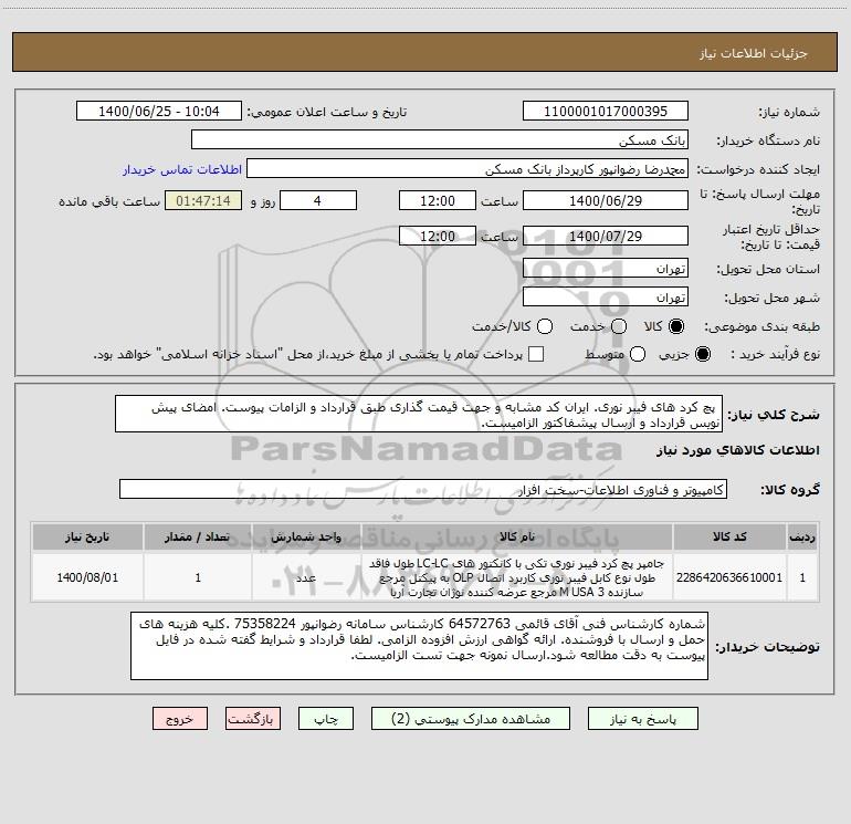 شرح کلی نیاز: پچ کرد های فیبر نوری. ایران کد مشابه و جهت قیمت گذاری طبق قرارداد و الزامات پیوست. امضای پیش نویس قرارداد و ارسال پیشفاکتور الزامیست.