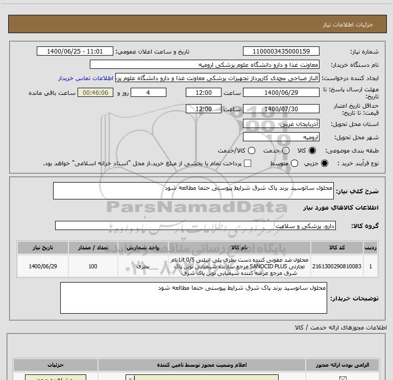 شرح کلی نیاز: محلول سانوسید برند پاک شرق شرایط پیوستی حتما مطالعه شود