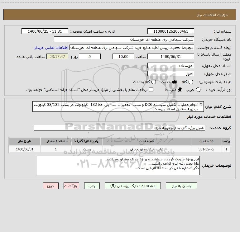 شرح کلی نیاز: انجام عملیات تکمیل سیستم DCS و تست تجهیزات سه بی خط 132 کیلو ولت در پست 33/132 کیلوولت بیدروبه مطابق اسناد پیوست.