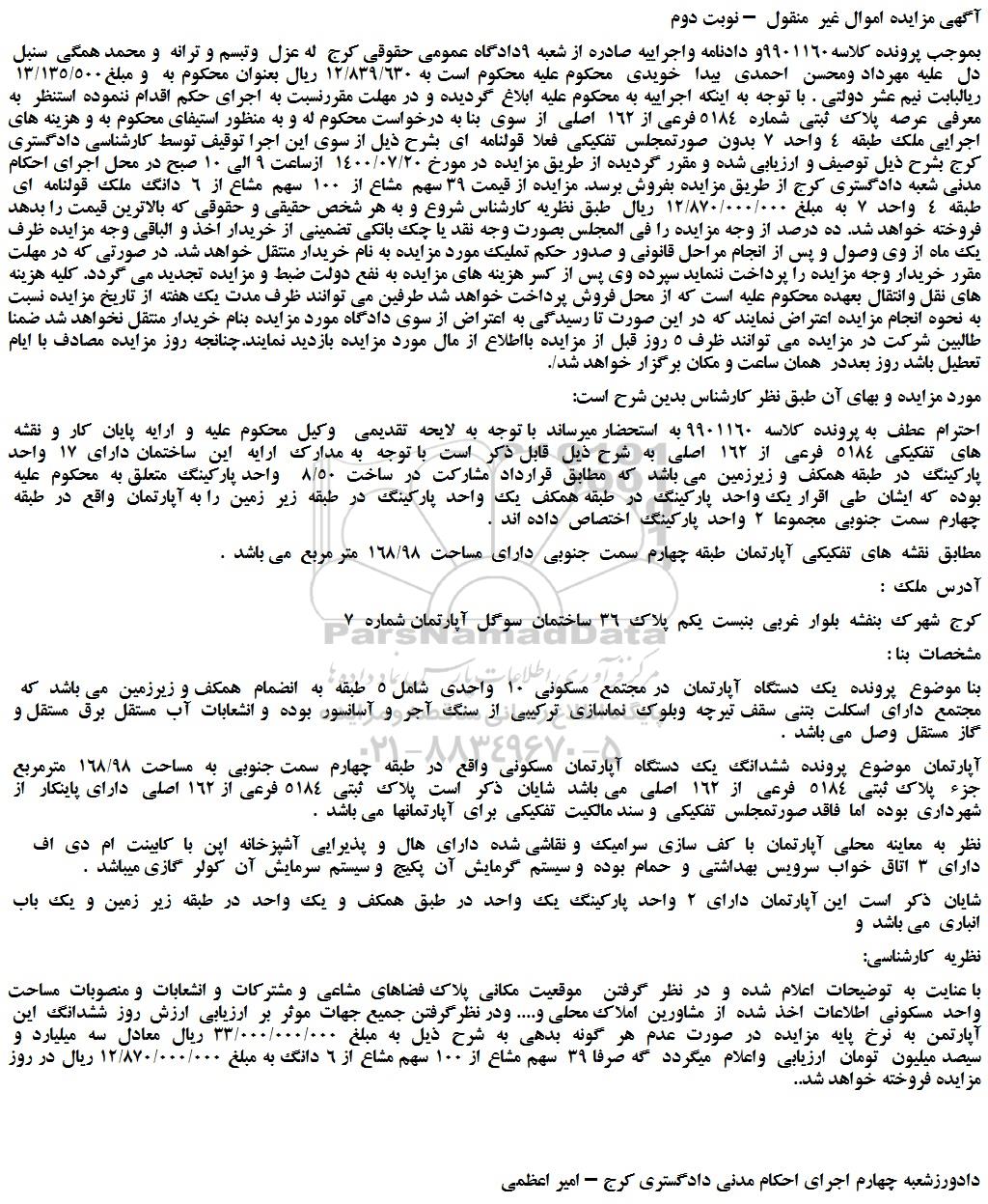 بموجب پرونده کلاسه9901160و دادنامه واجراییه صادره از شعبه 9دادگاه عمومی حقوقی کرج له عزل وتبسم و ترانه و محمد همگی سنبل دل علیه مهرداد ومحسن احمدی بیدا خویدی محکوم علیه محکوم است به 12/839/630 ریال بعنوان محکوم به و مبلغ13/135/500 ریالبابت نیم عشر دولتی . با توجه به اینکه اجراییه به محکوم علیه ابلاغ گردیده و در مهلت مقررنسبت به اجرای حکم اقدام ننموده استنظر به معرفی عرصه پلاک ثبتی شماره 5184 فرعی از 162 اصلی از سوی بنا به درخواست محکوم له و به منظور استیفای محکوم به و هزینه های اجرایی ملک طبقه 4 واحد 7 بدون صورتمجلس تفکیکی فعلا قولنامه ای بشرح ذیل از سوی این اجرا توقیف توسط کارشناسی دادگستری کرج بشرح ذیل توصیف و ارزیابی شده و مقرر گردیده از طریق مزایده در مورخ 1400/07/20 ازساعت 9 الی 10 صبح در محل اجرای احکام مدنی شعبه دادگستری کرج از طریق مزایده بفروش برسد. مزایده از قیمت 39 سهم مشاع از 100 سهم مشاع از 6 دانگ ملک قولنامه ای طبقه 4 واحد 7 به مبلغ 12/870/000/000 ریال طبق نظریه کارشناس شروع و به هر شخص حقیقی و حقوقی که بالاترین قیمت را بدهد فروخته خواهد شد. ده درصد از وجه مزایده را فی المجلس بصورت وجه نقد یا چک بانکی تضمینی از خریدار اخذ و الباقی وجه مزایده ظرف یک ماه از وی وصول و پس از انجام مراحل قانونی و صدور حکم تملیک مورد مزایده به نام خریدار منتقل خواهد شد. در صورتی که در مهلت مقرر خریدار وجه مزایده را پرداخت ننماید سپرده وی پس از کسر هزینه های مزایده به نفع دولت ضبط و مزایده تجدید می گردد. کلیه هزینه های نقل وانتقال بعهده محکوم علیه است که از محل فروش پرداخت خواهد شد طرفین می توانند ظرف مدت یک هفته از تاریخ مزایده نسبت به نحوه انجام مزایده اعتراض نمایند که در این صورت تا رسیدگی به اعتراض از سوی دادگاه مورد مزایده بنام خریدار منتقل نخواهد شد ضمنا طالبین شرکت در مزایده می توانند ظرف 5 روز قبل از مزایده بااطلاع از مال مورد مزایده بازدید نمایند.چنانجه روز مزایده مصادف با ایام تعطیل باشد روز بعددر همان ساعت و مکان برگزار خواهد شد/.