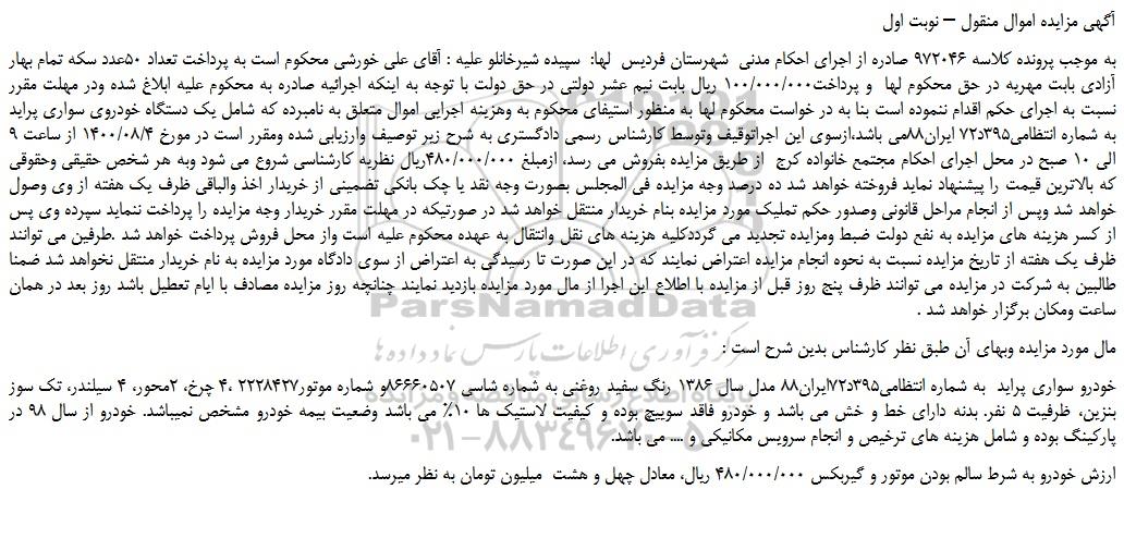 به موجب پرونده کلاسه 972046 صادره از اجرای احکام مدنی  شهرستان فردیس  لها:  سپیده شیرخانلو علیه : آقای علی خورشی محکوم است به پرداخت تعداد 50عدد سکه تمام بهار آزادی بابت مهریه در حق محکوم لها  و پرداخت100/000/000 ریال بابت نیم عشر دولتی در حق دولت با توجه به اینکه اجرائیه صادره به محکوم علیه ابلاغ شده ودر مهلت مقرر نسبت به اجرای حکم اقدام ننموده است بنا به در خواست محکوم لها به منظور استیفای محکوم به وهزینه اجرایی اموال متعلق به نامبرده که شامل یک دستگاه خودروی سواری پراید به شماره انتظامی395د72 ایران88می باشد،ازسوی این اجراتوقیف وتوسط کارشناس رسمی دادگستری به شرح زیر توصیف وارزیابی شده ومقرر است در مورخ 1400/08/4 از ساعت 9 الی 10 صبح در محل اجرای احکام مجتمع خانواده کرج  از طریق مزایده بفروش می رسد، ازمبلغ 480/000/000ریال نظریه کارشناسی شروع می شود وبه هر شخص حقیقی وحقوقی که بالاترین قیمت را پیشنهاد نماید فروخته خواهد شد ده درصد وجه مزایده فی المجلس بصورت وجه نقد یا چک بانکی تضمینی از خریدار اخذ والباقی ظرف یک هفته از وی وصول خواهد شد وپس از انجام مراحل قانونی وصدور حکم تملیک مورد مزایده بنام خریدار منتقل خواهد شد در صورتیکه در مهلت مقرر خریدار وجه مزایده را پرداخت ننماید سپرده وی پس از کسر هزینه های مزایده به نفع دولت ضبط ومزایده تجدید می گرددکلیه هزینه های نقل وانتقال به عهده محکوم علیه است واز محل فروش پرداخت خواهد شد .طرفین می توانند ظرف یک هفته از تاریخ مزایده نسبت به نحوه انجام مزایده اعتراض نمایند که در این صورت تا رسیدگی به اعتراض از سوی دادگاه مورد مزایده به نام خریدار منتقل نخواهد شد ضمنا طالبین به شرکت در مزایده می توانند ظرف پنج روز قبل از مزایده با اطلاع این اجرا از مال مورد مزایده بازدید نمایند چنانچه روز مزایده مصادف با ایام تعطیل باشد روز بعد در همان ساعت ومکان برگزار خواهد شد .