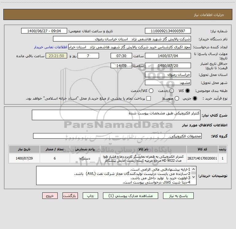 نام دستگاه خریدار:شرکت پالایش گاز شهید هاشمی نژاد استان خراسان رضوی