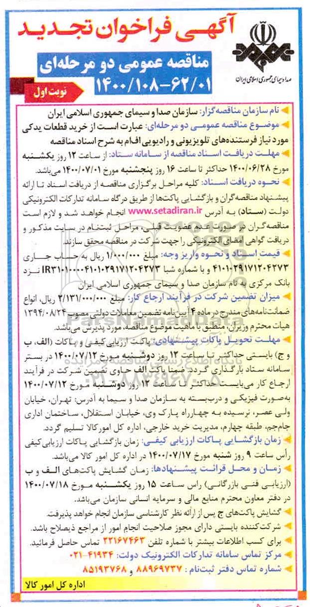 فراخوان مناقصه خرید قطعات یدکی مورد نیاز فرستنده های تلویزیونی و رادیویی تجدید, فراخوان مناقصه خرید قطعات یدکی مورد نیاز فرستنده های تلویزیونی و رادیویی تجدید