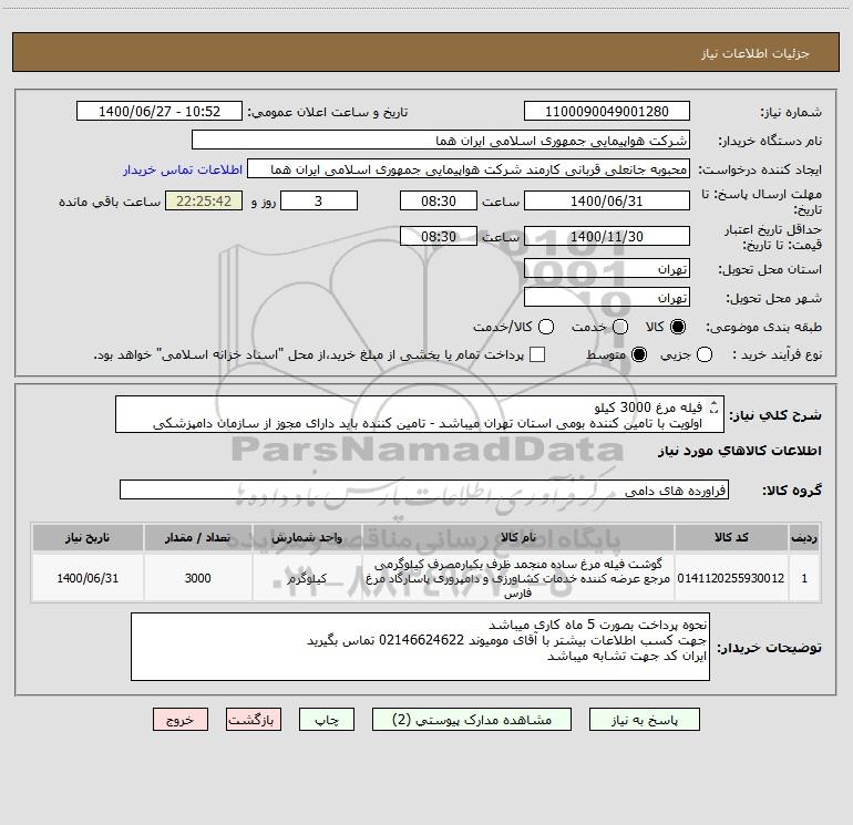استعلام فیله مرغ 3000 کیلو اولویت با تامین کننده بومی استان تهران میباشد - تامین کننده باید دارای مجوز از سازمان دامپزشکی کشور باشد , استعلام فیله مرغ 3000 کیلو اولویت با تامین کننده بومی استان تهران میباشد - تامین کننده باید دارای مجوز از سازمان دامپزشکی کشور باشد